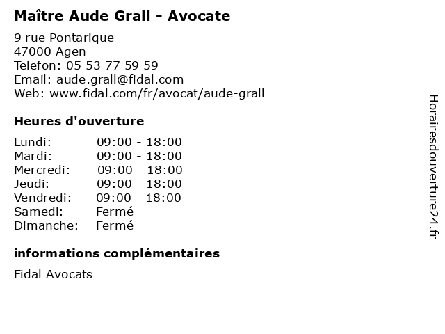 1 Maître Aude Grall - Avocate (Distance: 0,00 km) 9 Rue Pontarique, 47000 Agen aude, avocate, avocats, cabinet, conseils, contentieux, grall, juridique, justice, litiges, maître, services 2 Dr Aude Deloumeau - Rhumatologue (Distance: 1,97 km) - Route de Villeneuve, 47923 Agen agen, aude, centre, deloumeau, dr, hospitalier, locomoteur, nérac, rhumatologie, rhumatologue, rhume 3 Dr Aude Behaghel - Médecin généraliste (Distance: 5,60 km) 10 Route d'Agen, 47310 Roquefort aude, audo, behaghel, cabinet, des, docteur, docteurs, dr, generaliste, généraliste, jarry, medical, médecin, médicale, soin 4 Dr Aude Cally - Médecin généraliste (Distance: 5,60 km) 10 Route d’Agen, 47310 Roquefort aude, cally, docteur, dr, generaliste, généraliste, medical, médecin, soin 5 Maître Caroline Gouarrigues - Avocate (Distance: 0,26 km) 67 Cours Victor-Hugo, 47000 Agen avocate, avocats, caroline, civils, droits, gouarrigues, juridiques, maître 6 Maître Laurence Taste-Denise - Avocate (Distance: 0,26 km) 67 Cours Victor-Hugo, 47000 Agen avocate, avocats, civils, denise, droits, juridiques, laurence, maître, taste |