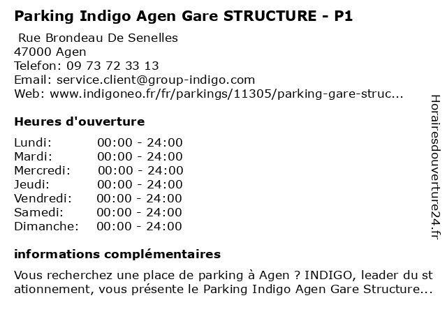 1 Parking Indigo Agen Gare SURFACE - P2 (Distance: 0,00 km) Rue Brondeau De Senelles, 47000 Agen agen, borne de recharge pour véhicules électriques, gare, indigo, p2, parking, surface 2 Borne de Recharge INDIGO (Distance: 0,03 km) Rue Brondeau De Senelles, 47000 Agen borne, de, indigo, recharge 3 Gare d'Agen - Guichet (Distance: 0,05 km) 1 place Rabelais, 47000 Agen agen, billetterie, d'agen, gare, guichet, services, station 5 Onepark / Gare d'Agen (Courte et Longue durée) Parking (Distance: 0,22 km) 1 Place Rabelais, 47000 Agen courte, d'agen, durée, et, gare, longue, onepark, parking, services 6 Parking Indigo Agen Marché (Distance: 0,60 km) 24 Place Jean-baptiste Durand, 47000 Agen agen, borne de recharge pour véhicules électriques, indigo, marché, parking |
