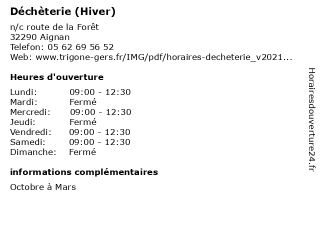 1 Déchèterie (Été) (Distance: 0,00 km) n/c route de la Forêt, 32290 Aignan bennes, collecte, déchets, déchèterie, gravats, tri, été 2 Déchèterie (Distance: 10,49 km) - lieu-dit Les Abouats, 32160 Plaisance bennes, collecte, déchets, déchèterie, gravats, tri 3 Déchèterie (Distance: 10,88 km) - chemin d'Estalens, 32110 Nogaro bennes, collecte, déchets, déchèterie, gravats, tri 4 Déchèterie (Distance: 14,32 km) - Rue de la Menoue, 32400 Riscle bennes, collecte, déchets, déchèterie, gravats, tri 5 Déchèterie (Distance: 18,42 km) - lieu-dit Ransan, 32800 Eauze bennes, collecte, déchets, déchèterie, gravats, tri 6 Déchèterie (Distance: 18,80 km) - Chemin de la Téoulère, 32190 Vic-Fezensac bennes, collecte, déchets, déchèterie, gravats, tri |