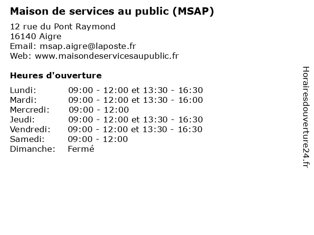 1 Maison de services au public (Distance: 13,22 km) 21 rue Martin, 16230 Mansle administration, au, de, maison, mansle, organismes, public, publics, services 2 France Services (Distance: 32,70 km) 2 Place du Champ-de-Foire, 79170 Brioux-sur-Boutonne administration, au, de, france, mairie, maison, msap, public, service, services 3 France Services (Distance: 46,58 km) 1 Route de Montmoreau, 16250 Côteaux-Du-Blanzacais administration, au, de, france, mairie, maison, msap, public, service, services 4 Maison de services au public (MSAP) (Distance: 55,96 km) 5 rue du Commerce, 86460 Availles-Limouzine administration, au, availles, de, limouzine, maison, msap, organismes, public, publics, services 5 MMA Assurances AIGRE (Distance: 0,12 km) 3 Grande Rue, 16140 Aigre aigre, assurance au tiers, assurance auto, assurance auto au tiers, assurance auto pas cher, assurance auto tous risques, assurance habitation, assurance habitation pas cher, assurance local, assurance multirisque, assurance professionnelle, assurance santé, assurance tous risques, assurance voiture, assurances, flotte, garantie décennale, mma, mutuelle, mutuelle sénior, rc pro, responsabilité civile 6 Mairie d'Aigre (Distance: 0,13 km) 2 Rue de l'Hôtel de Ville, 16140 Aigre administration, d'aigre, mairie, service public |