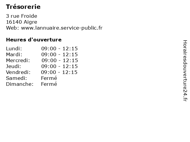 1 Trésorerie de Mansle (Distance: 13,13 km) 19 Boulevard Gambetta, 16230 Mansle administration, de, finances, impôts, mansle, public, publiques, trésor, trésorerie 2 Trésorerie de Rouillac (Distance: 14,28 km) 97 Place Thiers, 16170 Rouillac administration, de, finances, impôts, public, publiques, rouillac, trésor, trésorerie 3 Trésorerie (Distance: 27,85 km) 42 rue Jean-Jaurès, 16160 Gond-Pontouvre administration, assoc, services, services publics, trésorerie 4 Trésorerie (Distance: 29,41 km) 55 place Auguste-Rouyer, 16600 Ruelle-sur-Touvre administration, assoc, services, services publics, trésorerie 5 Trésorerie (Distance: 29,79 km) 11 boulevard de Bury, 16017 Angoulême administration, assoc, services, services publics, trésorerie 6 Trésorerie (Distance: 33,31 km) . Place Chaume A Chauvin, 16120 Châteauneuf-sur-Charente administration, assoc, services, services publics, trésorerie |