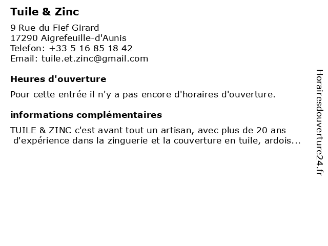 2 Le Zinc (Distance: 17,02 km) 12 Quai Duperré, 17000 La Rochelle bar, bistro, bistrot, brasserie, café, le, pub, restaurant, restauration, resto, zinc 3 LE BORDIN ZINC (Distance: 34,43 km) 12 Place Anatole France, 17410 Saint Martin de Ré bordin, le, zinc 5 LES TOITURES DE L'ILE DE RE (Distance: 44,61 km) 13 Rue du Gâte Grenier, 17590 Ars-en-Ré de, l'ile, les, nettoyage des toitures, pose de gouttière en zinc, re, réféction des toitures, rénovation des toitures, réparation de gouttière en zinc, toiture en rénovation, toiture neuve, toitures, travaux de construction, zinguerie |