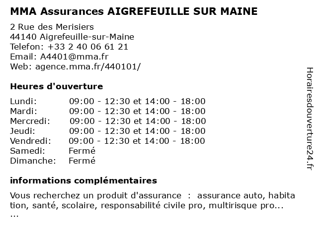 1 MMA AIGREFEUILLE SUR MAINE (Distance: 0,00 km) 2 Rue des Merisiers, 44140 Aigrefeuille-sur-Maine aigrefeuille, maine, mma, sur 6 Mma Assurance (Distance: 16,25 km) 5 Place Cambronne, 44232 Saint-Sébastien-sur-Loire assurance, assurance auto, assurance vie, couverture santé des salariés, mma, son activité |