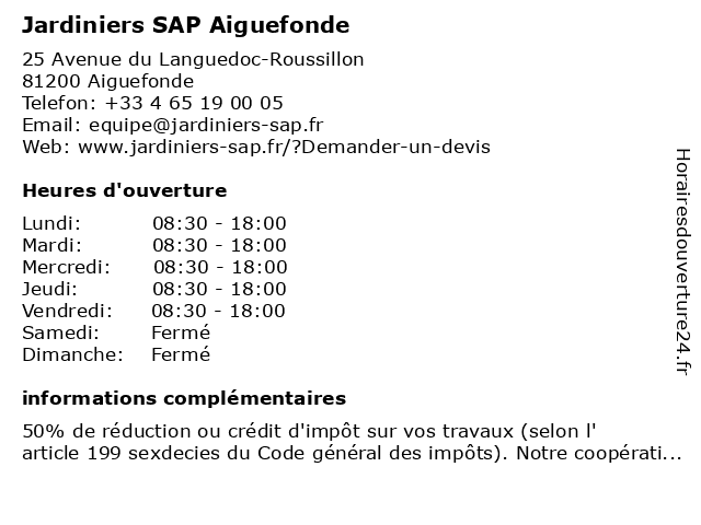 1 Jardiniers SAP Palleville (Distance: 28,12 km) 4 Impasse du Louvre, 81700 Palleville jardiniers, palleville, sap 2 Jardiniers SAP Palleville (Distance: 28,12 km) 4 Impasse du Louvre, 81700 Palleville jardiniers, palleville, sap 4 Jardiniers SAP Carcassonne (Distance: 34,58 km) Rte de Limoux, 11000 Carcassonne carcassonne, jardiniers, sap 5 Jardiniers SAP Puygouzon (Distance: 44,71 km) 12 Rue d'Al Causse, 81990 Puygouzon jardiniers, puygouzon, sap 6 |