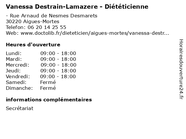 1 Elodie Cazalet - Diététicienne (Distance: 7,48 km) - Place de la République, 30220 Saint-Laurent-d'Aigouze aliment, cazalet, dieticien, diététicienne, elodie, medecin, nutrition 2 Charline Schwilden - Diététicienne (Distance: 8,32 km) 145 Avenue de l'Europe, 34280 La Grande-Motte bien, charline, diététicien, diététicienne, diététiciens, nutrition, s'alimenter, schwilden 3 Amélie Girard - Diététicienne (Distance: 8,50 km) 55 Avenue de Melgueil, 34280 La Grande-Motte 34280, amélie, diététicien, diététicienne, girard, grande, motte 4 Le Panier de Vanessa (Distance: 10,22 km) Avenue Plein Soleil, 34280 La Grande Motte de, le, panier, vanessa 5 Elisa Cauvi - Diététicienne (Distance: 13,44 km) 29 Chemin de Dassargues, 34400 Lunel alimentation, cauvi, dieteticien, diététicienne, elisa, nourriture, sante 6 Institut De Beauté Vanessa. B (Distance: 14,05 km) D6313, 30470 Aimargues beauté, de, institut, vanessa. |