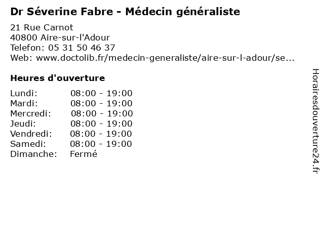 1 Pharmacie Bignon-Fabre (Distance: 15,06 km) . rue Principale, 32400 Viella bignon, fabre, homéopathie, médicaments, orthopédie, parapharmacie, pharmacie 2 Séverine Parassols - Infirmière (Distance: 42,75 km) 5 Rue Bernard de Clairvaux, 64000 Pau infirmier, infirmière, medecin, parassols, sante, severine, soins, séverine 3 Séverine Tardieu Architecte (Distance: 44,52 km) 26 Boulevard du Commandant Mouchotte, 64000 Bizanos architecte, conception, maquette, sarl, séverine, tardieu, travaux 4 Dr Annie-Claude Fabre - Médecin généraliste (Distance: 46,71 km) 37 Rue du Colonel Gloxin, 64000 Pau annie, claude, consultation, docteur, dr, dr., fabre, générale, généraliste, libre, médecin, médecine, santé 6 |
