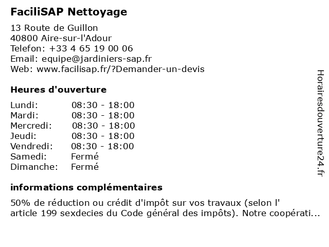 2 FaciliSAP Nettoyage BASSERCLES (Distance: 32,47 km) Route du Soleil Levant, 40700 Bassercles bassercles, facilisap, nettoyage 5 FaciliSAP Nettoyage (Distance: 46,83 km) 25B Avenue de Lorraine, 32190 Vic-Fezensac facilisap, nettoyage 6 MSTP (Distance: 21,23 km) 573 Avenue des Pyrénées, 40190 Villeneuve-de-Marsan bardage extérieur, charpente, construction de maison à ossature bois, couverture, isolation, mstp, nettoyage façade et toiture, travaux de maçonnerie, zinguerie |