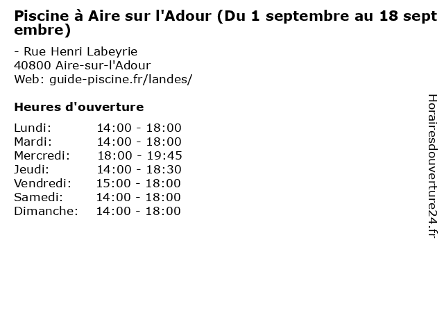 1 Piscine à Aire sur l'Adour (Du 23 mai au 5 juillet) (Distance: 0,00 km) - Rue Henri Labeyrie, 40800 Aire-sur-l'Adour 23, aire, au, du, juillet, l'adour, mai, natation sportive, piscine, sportif, sur 2 Piscine à Aire sur l'Adour (Du 6 juillet au 31 août) (Distance: 0,00 km) - Rue Henri Labeyrie, 40800 Aire-sur-l'Adour 31, aire, août, au, du, juillet, l'adour, natation sportive, piscine, sportif, sur 3 Plaimont (septembre à décembre) (Distance: 9,93 km) - Route d'Orthez, 32400 Saint-Mont décembre, plaimont, septembre, vigneron, vins 4 Piscine à Geaune (Juin ) (Distance: 12,07 km) 4 chemin de la piscine, 40320 Geaune geaune, juin, natation sportive, piscine, sportif 5 Piscine à Geaune (Juillet et août ) (Distance: 12,07 km) 4 chemin de la piscine, 40320 Geaune août, et, geaune, juillet, natation sportive, piscine, sportif 6 Piscine à Grenade sur l'Adour (Juillet et août ) (Distance: 16,42 km) 1 rue Pierre de Coubertin, 40270 Grenade-sur-l'Adour août, et, grenade, juillet, l'adour, natation sportive, piscine, sportif, sur |