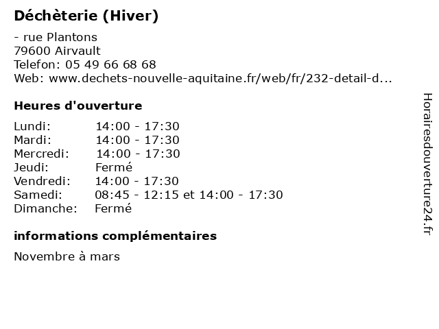 1 Déchèterie (Hiver) (Distance: 9,57 km) - Route Notre Dame d'Or, 86110 La Grimaudière bennes, collecte, déchets, déchèterie, détritus, hiver, poubelles 2 Déchèterie (Hiver) (Distance: 10,80 km) - La Martinière, 79600 Louin déchèterie, gravats, hiver, huiles usées, la réception des déchets et écocentres, les appareils électroménagers, les déchets verts, papier et carton en quantité 3 Déchèterie (Hiver) (Distance: 13,79 km) - Route de Martaizé, 86330 Saint-Clair bennes, collecte, déchets, déchèterie, détritus, hiver, poubelles 4 Déchèterie (Hiver) (Distance: 19,66 km) - lieu-dit La Loge, 79330 Coulonges-Thouarsais bennes, collecte, débarras, déchets, déchèterie, hiver, ordures 5 Déchèterie (Été) (Distance: 0,00 km) - rue Plantons, 79600 Airvault bennes, collecte, débarras, déchets, déchèterie, ordures, été 6 Déchèterie (Distance: 9,40 km) - La Croix, 79390 Thénezay déchèterie, gravats, huiles usées, la réception des déchets et écocentres, les appareils électroménagers, les déchets verts, papier et carton en quantité |