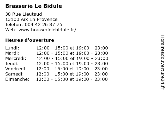 | Dimanche | 12:00-15:00 et 19:00-23:00 |