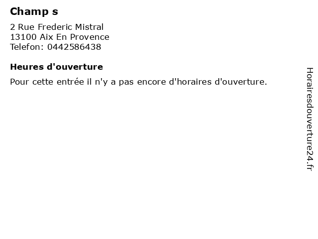 1 Bar Tabac Le Champ De Mars (Distance: 0,72 km) 13 Boulevard des Poilus, 13100 Aix-en-Provence bar, champ, de, e-liquides, electronique, journaux, le, mars, presse, tabac, vap, vapoteuse 2 Champ Vert - Le Moulin de la Sartan (Distance: 25,51 km) 4 rue Louis Reybaud, 13012 Marseille champ, de, la, le, marseille, moulin, sartan, vert 3 Le Champ de Mars (Distance: 26,42 km) 12 Rue André Poggioli, 13006 Marseille bar, champ, de, le, mars, restauration 4 Pharmacie Champ de Mars (Distance: 59,84 km) 51 Avenue Colonel Fabien, 83000 Toulon champ, de, mars, pharmacie 5 Pharmacie Herboristerie Champ de Mars (Distance: 59,85 km) 51 Avenue Colonel Fabien, 83000 Toulon champ, de, herboristerie, mars, pharmacie |