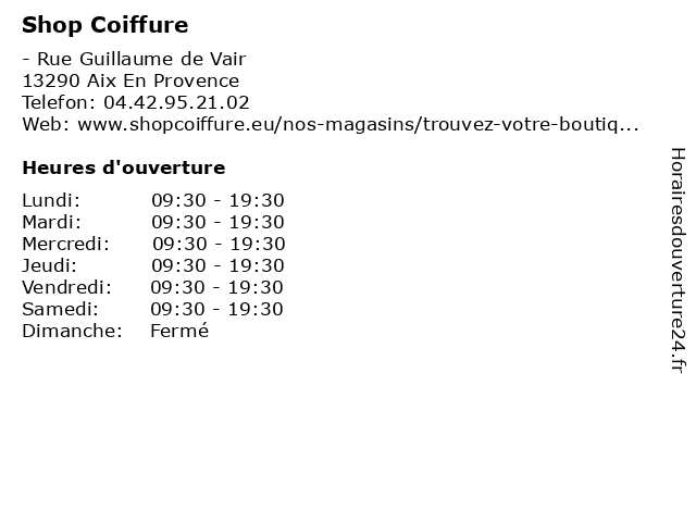 1 Kokoon Animal Shop Aix La Pioline (Distance: 0,24 km) 245 Avenue Guillaume du Vair, 13290 Aix-en-Provence aix, animal, kokoon, la, pioline, shop 2 Franck Provost Coiffure (Distance: 0,49 km) 1175 rue Guillaume du Vair, 13290 Aix-en-Provence beauté, cheveux, coiffure, franck, provost, salon, service 3 Alison Cassuto Coiffure (Distance: 2,61 km) 298 Avenue du Club Hippique, 13090 Aix-en-Provence alison, beauté, cassuto, coiffure, coiffures, coloristes 4 Casino Shop (Distance: 3,10 km) 159 Avenue Fortune, 13100 Aix-en-Provence casino, fr, hypermarchés, magasins, shop, shop., supermarchés 5 Sunset Coiffure (Distance: 3,69 km) 15 Avenue des Belges, 13100 Aix-en-Provence beauté, coiffure, coiffures, coloristes, sunset 6 Evolution Coiffure (Distance: 3,80 km) 135 Avenue Joseph Villevieille, 13100 Aix-en-Provence boutique de chaussures, coiffure, evolution, femme, luxe homme |