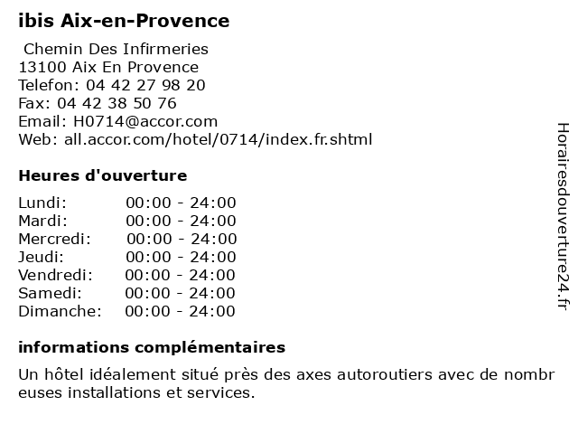 1 Ibis budget Aix en Provence (Distance: 0,13 km) . Chemin des Infirmeries, 13100 Aix-en-Provence aix, budget, cafe, en, hotel, ibis, provence, restaurant, service 2 ibis Styles Aix-en-Provence Mas des Oliviers (Distance: 4,22 km) 3 Bd de la grande thumine, 13090 Aix En Provence aix, des, en, ibis, mas, oliviers, provence, styles 3 ibis budget Aix-en-Provence Est Le Canet (Distance: 5,38 km) Rond Point Du Canet, 13590 Meyreuil aix, budget, canet, en, est, ibis, le, provence 4 ibis budget Aix-en-Provence Est Sainte-Victoire (Distance: 5,61 km) La garderine, 13590 Meyreuil aix, budget, en, est, ibis, provence, sainte, victoire 5 ibis budget Aix-en-Provence Les Milles (Distance: 8,06 km) 10 Rue Du Lieutenant Parayre, 13290 Aix En Provence aix, budget, en, ibis, les, milles, provence 6 ibis Styles Cabriès Aix-en-Provence TGV (Distance: 11,36 km) 900 Allee Du Golf, 13480 Cabries aix, cabriès, en, ibis, provence, styles, tgv |