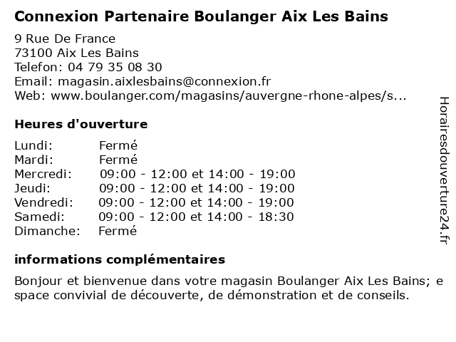 | Mercredi | 09:00-12:00 et 14:00-19:00 |