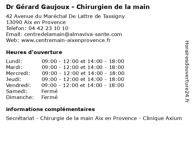 2 Dr Gérard Benitha - Médecin généraliste (Distance: 1,06 km) 3 Rue Jean Rostand, 13100 Aix-en-Provence benitha, consultation, de, docteur, dr, dr., gerard, générale, généraliste, gérard, horaires, libre, medecins, médecin, médecine, santé 3 Dr Gérard Jeanblanc - Médecin morphologique et anti-âge - secrétariat (Distance: 2,78 km) 122 Bis Cours Gambetta, 13100 Aix-en-Provence anti, dr, et, gérard, jeanblanc, morphologique, médecin, médecins, médicaments, santé, secrétariat, spécialiste, âge 4 Agnès Schweitzer - La Main Présence (Distance: 5,61 km) 17 Square Abbé Blaise, 13080 Aix-en-Provence agnès, la, main, présence, schweitzer 6 Main Sage (Distance: 13,71 km) 21 Boulevard Marcel Pagnol, 13650 Meyrargues bien-etre, main, massages, relax, sage, sante |