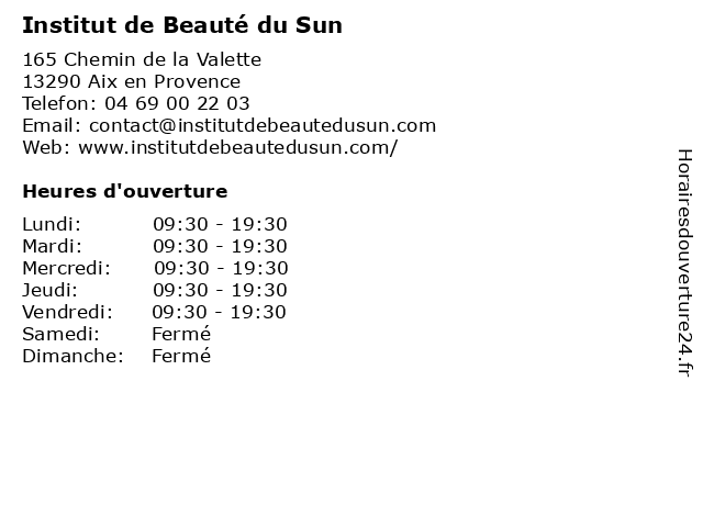1 Sun Gym (Distance: 0,01 km) 165 Chemin de la Valette, 13290 Aix-en-Provence business, center, fitness, gym, health, sun 2 Institut du Cours (Distance: 6,57 km) 5 Rue Clemenceau, 13100 Aix-en-Provence beauté, cours, du, institut, massage, peau, relax, salon, soins 6 |