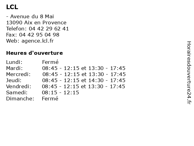 1 LCL (Distance: 1,05 km) - Place Jeanne d'Arc, 13100 Aix-en-Provence agence, assurance, bancaire, banque, lcl 3 LCL (Distance: 1,31 km) 20 Cours Mirabeau, 13100 Aix-en-Provence agence, assurance, bancaire, banque, lcl 4 LCL (Distance: 1,57 km) 1 Avenue Fortune Ferrini, 13090 Aix en Provence agence, assurance, bancaire, banque, lcl 5 LCL (Distance: 1,75 km) 49 Boulevard Aristde Briand, 13100 Aix En Provence banque, crédit, lcl, service 6 LCL (Distance: 2,24 km) 500 Route de Berre, 13090 Aix en Provence agence, assurance, bancaire, banque, lcl |
