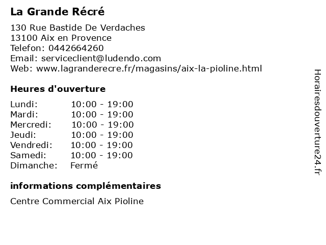 1 La Grande Récré (Distance: 10,20 km) s/n Chemin de la Grande Campagne, 13480 Cabriès grande, jeux, jouets, la, loisirs, récré 2 La Grande Récré (Distance: 12,74 km) . Avenue Plan De Campagne, 13480 Cabries enfant, grande, jouets, la, loisirs, magasin, recré, récré 3 Léonard Parli - La Nouvelle Grande Fabrique (Distance: 3,33 km) 95 rue Famille Laurens, 13290 Aix-en-Provence calisson, chocolats, confiserie, d'aix, fabrique, glaces, grande, la, léonard, nouvelle, parli 4 La grande savonnerie (Distance: 4,20 km) 22 Rue Des Cordeliers, 13100 Aix-en-Provence accessoires et décoration, grande, la, les dépôts-ventes, les métiers d’art, savonnerie 5 La Grande Boutique (Distance: 4,22 km) 7 bis Rue de la Glacière, 13100 Aix-en-Provence accessoires, boutique, femme, grande, la, mode, vêtements 6 Grande Pharmacie Provençale (Distance: 5,59 km) 101 Chemin de Beauregard, 13100 Aix-en-Provence grande, pharmacie, provençale |