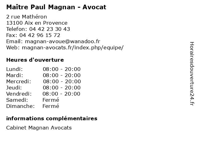 1 Maître Joseph Magnan - Avocat (Distance: 0,00 km) 2 rue Mathéron, 13100 Aix en Provence avocat, avocats, cabinet, conseils, contentieux, joseph, juridique, justice, litiges, magnan, maître, services 2 Ecole élémentaire publique Paul Cézanne (Distance: 10,02 km) - Hameau de Biver, 13120 Gardanne cio, college, cours, cézanne, ecole, education, elementaire, enseignement, lycee, maternelle, nationale, orientation, paul, primaire, privé, privée, public, publique, élémentaire 3 CRF Paul Cezanne -Cardiologie ( secrétariat ) (Distance: 13,61 km) 929 route degardanne, 13105 Mimet cardiologie, cezanne, consultation, crf, docteur, paul, santé, secrétariat 4 Centre de Rééducation Paul Cézanne Mimet - Pneumologie (secrétariat ) (Distance: 13,61 km) 929 Route de Gardanne, 13105 Mimet centre, consultation, cézanne, de, docteur, mimet, paul, pneumologie, rééducation, santé, secrétariat 5 crrf paul cezanne - Médecine physique et de réadaptation (secrétariat ) (Distance: 13,61 km) 929 route degardanne, 13105 Mimet cezanne, consultation, crrf, de, docteur, et, médecine, paul, physique, réadaptation, santé, secrétariat 6 Paul (Distance: 13,95 km) - de campagne, 13480 Cabries pains, patisserie, paul, traiteur, viennoiserie |