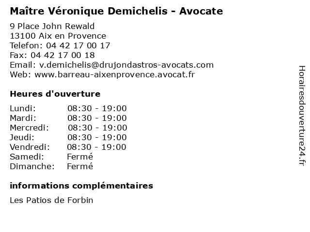 1 Maître Véronique Dalbies - Avocate (Distance: 0,32 km) 12 rue d'italie, 13100 Aix en Provence avocate, avocats, civils, dalbies, droits, juridiques, maître, véronique 2 Maître Véronique Mondino-Grolleau - Avocat (Distance: 0,32 km) 12 Rue d'Italie, 13100 Aix-en-Provence avocat, grolleau, justice, lois, maitre, maître, mondino, véronique 3 Guichard Catoire Véronique (Distance: 0,76 km) 38 Avenue Victor Hugo, 13100 Aix-en-Provence catoire, guichard, véronique 4 Dr Véronique Voinchet - Chirurgien plasticien et esthétique (Distance: 0,96 km) 90 Avenue Napoléon Bonaparte, 13100 Aix-en-Provence chirurgie, chirurgien, dr, esthétique, et, general, plasticien, soins, voinchet, véronique 5 Véronique Villiers - Psychologue (Distance: 1,06 km) 15 Avenue des Belges, 13100 Aix-en-Provence psy, psychiatre, psychologue, sante, soins, villiers, véronique 6 Dr Véronique Seguy-Coutier - Médecin généraliste (Distance: 1,63 km) - Avenue des Tamaris, 13616 Aix-en-Provence consultation, coutier, docteur, dr, généraliste, med, médecin, médecine, seguy, traitement, veronique, véronique |