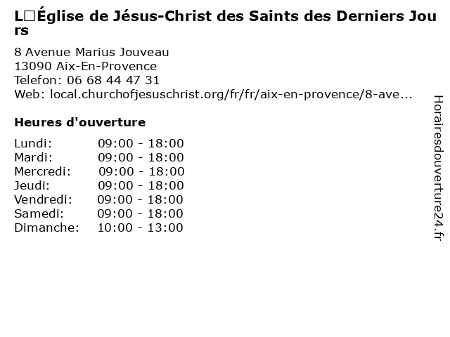 1 L’Église de Jésus-Christ des Saints des Derniers Jours (Distance: 17,65 km) La Petite Garrigue Avenue Salyens, 13127 Vitrolles christ, de, derniers, des, jours, jésus, l’église, organisation religieuse, saints 2 Atlantis Parc ( vacances scolaires ainsi que les jours fériés) (Distance: 18,41 km) s/n Chemin des Pennes, 13170 Les Pennes Mirabeau ainsi, atlantis, culture, fériés, jours, les, loisirs, multimédia, parc, période, que, scolaire, scolaires, vacances 3 Ecole primaire privée Sainte Thérèse de L'Enfant-Jésus (Distance: 18,64 km) - Boulevard de Casablanca Saint-Antoine, 13015 Marseille cio, college, cours, de, ecole, education, elementaire, enseignement, jésus, l'enfant, lycee, maternelle, nationale, orientation, primaire, prive, privee, privée, sainte, thérèse 4 Agence Funéraire Internationale (Distance: 0,75 km) 1 Rue de la Molle, 13100 Aix-en-Provence agence, articles funéraires, contrats obsèques, devis gratuit, funéraire, internationale, organisation d'obsèques, rapatriement, travaux de marbrerie 5 Location de salle | Le Relais de la Chevalière (Distance: 0,79 km) 4 Rue Van Loo, 13100 Aix-en-Provence chevalière, de, la, le, location, location salle mariage, location salle mariages orientaux, location salle soirée étudiante, organisation d'événements, relais, réunions d'entreprise, salle, salle anniversaires, salle séminaire, salle événementielle, événements privés, événements professionnels 6 Apprentis d’Auteuil - ARES Aix Formation (Distance: 0,94 km) 2 Place Romée de Villeneuve, 13090 Aix-en-Provence aix, apprentis, ares, centre, de, dons, d’auteuil, formation, organisation, professionnel, social |