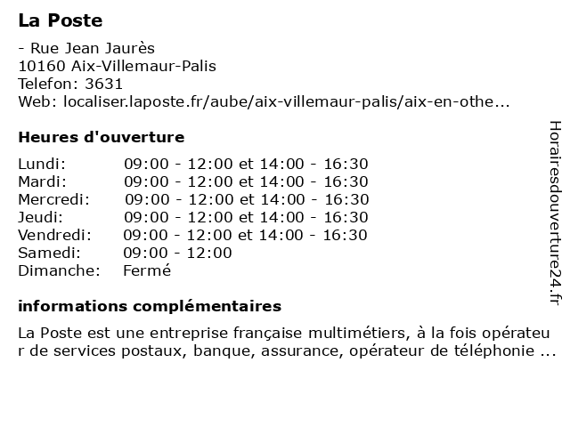 2 La Poste (Distance: 3,81 km) 1 Route de Palis, 10190 Aix-Villemaur-Palis express chronopost, la, poste, réexpédition internationale 3 La Poste (Distance: 7,43 km) 2 Place Gambetta, 10190 Aix-Villemaur-Palis agence, assurance, banque, banque postale, bureau de poste, chronopost, colis, courrier, dps, expéditions internationales, la, point, postale, poste, relais, timbres, téléphonie, ups, western union 4 La Poste (Distance: 7,56 km) 3 Rue Charles Petit, 10160 Saint-Mards-en-Othe express chronopost, la, poste, réexpédition internationale 5 La Poste (Distance: 7,70 km) 37 Grande Rue, 10160 Rigny-le-Ferron agence, assurance, banque, banque postale, bureau de poste, chronopost, colis, courrier, dps, expéditions internationales, la, point, postale, poste, relais, timbres, téléphonie, ups, western union 6 La Poste (Distance: 7,71 km) 37 Grande Rue, 10160 Rigny le Ferron express chronopost, la, poste, réexpédition internationale |