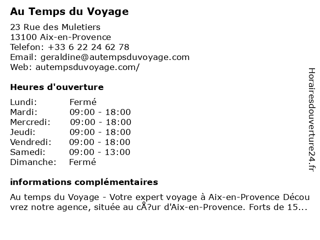 1 Café du Temps (Distance: 0,19 km) 31 Rue de la Couronne, 13100 Aix-en-Provence boisson, brasserie, café, du, restauration, temps 2 Le Temps des Cerises (Distance: 0,42 km) 165 Avenue Giuseppe Verdi, 13100 Aix-en-Provence accessoires, cerises, des, habillement, le, mode, pret à porter, temps, vêtements 3 Le temps des cerises (Distance: 0,49 km) 24 Cours Mirabeau, 13100 Aix-en-Provence boutique de chaussures, cerises, des, femme, le, luxe homme, temps 4 Demiro Voyage (Distance: 6,16 km) 132 Allée du Verdon, 13770 Venelles agence, boutique, demiro, destinations, tourisme, tours, vacances, voyage 5 Le Temps d'un Présent (Distance: 12,70 km) 20 Boulevard Loubet, 13710 Fuveau arts, bien-être, bijoux, cadeaux, café, d'un, de, décoration, la, le, présent, table, temps, thé 6 Le Temps d'Une Beauté (Distance: 13,74 km) 3 Le Clos des Oliviers, 13105 Mimet beauté, d'une, institut, le, manucure, soins, temps, épilation |