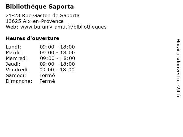 1 Bibliothèque de la Halle aux Grains (Distance: 0,17 km) . Place de l'Hôtel-de-Ville, 13100 Aix-en-Provence aux, bibliothèque, de, grains, halle, la, livre, médiathèque, services 2 Bibliothèque Aix (Distance: 0,42 km) 2 Avenue Jules Isaac, 13100 Aix-en-Provence aix, bibliothèque, livre, médiathèque, services, université 3 Bibliothèque de Méjanes (Inscription, Consultation, Emprunt) (Distance: 0,87 km) 8-10 Rue des Allumettes, 13100 Aix-en-Provence bibliothèque, consultation, de, emprunt, inscription, livre, médiathèque, méjanes, services 4 Bibliothèque de Méjanes (Accueil,Renseignements,Retour des documents) (Distance: 0,87 km) 8-10 Rue des Allumettes, 13100 Aix-en-Provence accueil, bibliothèque, de, des, documents, livre, médiathèque, méjanes, renseignements, retour, services 5 Bibliothèque Schuman Droit (Distance: 1,34 km) 3 Avenue Robert Schuman, 13626 Aix-en-Provence bibliothèque, droit, livre, médiathèque, schuman, services, université 6 Bibliothèque Ferry (Distance: 1,37 km) 14 Avenue Jules Ferry, 13621 Aix-en-Provence bibliothèque, ferry, livre, médiathèque, services, université |