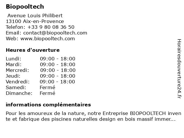 1 Biopooltech (Distance: 0,72 km) - avenue Louis Philibert, 13290 Aix-en-Provence biopooltech, construction, entretion, piscine |