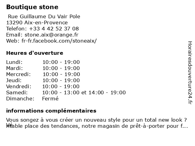 | Samedi | 10:00-13:00 et 14:00-19:00 |