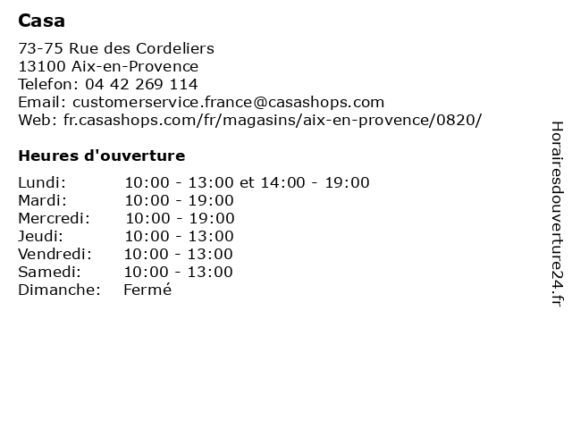 1 Casa (Distance: 7,40 km) - Avenue de la Grande Begude, 13770 Venelles ameublement, casa, cuisine, déco, maison, vaisselle 2 Casa (Distance: 17,49 km) 186 route d'Aix en Provence, 84120 Pertuis ameublement, cadeaux, casa, décoration, magasin, maison 3 Casa (Distance: 19,55 km) 15 Avenue de Saint-Antoine, 13015 Marseille ameublement, cadeaux, casa, décoration, magasin, maison 4 Casa (Distance: 19,93 km) 11 Avenue de Saint Antoine, 13464 Marseille beaute, casa, chaussures, deco, enfants, mode femmes, mode hommes, restaurant, sport 5 La Casa De Tapas (Distance: 0,25 km) 35 Rue de la Verrerie, 13100 Aix-en-Provence apéritifs, boissons, casa, de, la, restaurant, tapas 6 A Casa Bianca (Distance: 0,35 km) 9 Rue Jacques De La Roque, 13100 Aix En Provence bianca, casa, farina, restaurants |