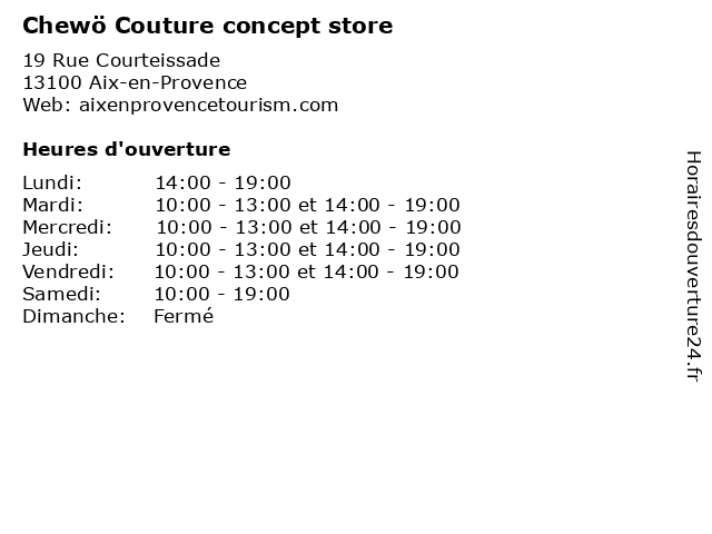 | Mercredi | 10:00-13:00 et 14:00-19:00 |