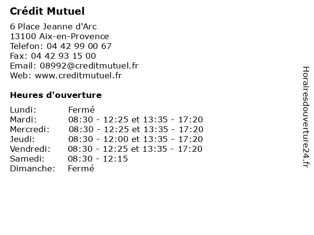 1 Crédit Mutuel (Distance: 0,01 km) 6 Place Jeanne D Arc, 13100 Aix En Provence compagnie de téléphone, crédit, mutuel, organisme d'assurance 2 Crédit Mutuel (Distance: 0,37 km) 4 Place des Chapeliers, 13100 Aix-en-Provence assurances, bancaire, banque, crédit, mutuel, services 3 Crédit Mutuel (Distance: 0,41 km) 34 Cours Mirabeau, 13100 Aix-en-Provence agence, assurance, bancaire, banque, crédit, mutuel 4 Crédit Mutuel (Distance: 0,41 km) 34 Cours Mirabeau, 13100 Aix En Provence compagnie de téléphone, crédit, mutuel, organisme d'assurance 5 Crédit Mutuel (Distance: 0,87 km) 30 Avenue de l'Europe, 13090 Aix-en-Provence agence, assurance, bancaire, banque, crédit, mutuel 6 Crédit Mutuel (Distance: 3,39 km) 190 Rue Marcelle Isoard, 19090 Aix-en-Provence agence, assurance, bancaire, banque, crédit, mutuel |