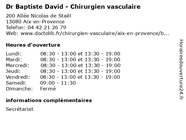 1 Dr Jean-Victor Chazot - Chirurgien vasculaire (Distance: 0,00 km) 200 Allée Nicolas de Staël, 13080 Aix-en-Provence chazot, chirurgie, chirurgien, dr, general, jean, soins, vasculaire, victor 2 Dr Samy Pouget - Chirurgien vasculaire (Distance: 0,00 km) 200 Allée Nicolas de Staël, 13080 Aix-en-Provence chirurgie, chirurgien, dr, general, pouget, samy, soins, vasculaire 3 Dr David Denaeghel - Radiologue (Distance: 0,04 km) 235 Allee Nicolas Stael, 13080 Aix-en-Provence d'aix, david, de, denaeghel, diagnostique, dr, imagerie, irm, pays, provence, radiologie, radiologue, thérapeutique 4 Dr David Barriol - Chirurgien urologue (Distance: 0,04 km) 200 allée Nicolas de Staël, 13080 Aix-en-Provence barriol, chirurgien, chiurgie, david, dr, general, soins, urologue 5 Jean-Louis David (Distance: 1,27 km) 784 Avenue du Club Hippique, 13090 Aix-en-Provence coiffeur, david, jean, louis, mixte 6 Jean Louis David (Distance: 2,28 km) s/n de la Pioline, 13290 Aix les milles beauté, cheveux, david, jean, louis, ongles, salon |