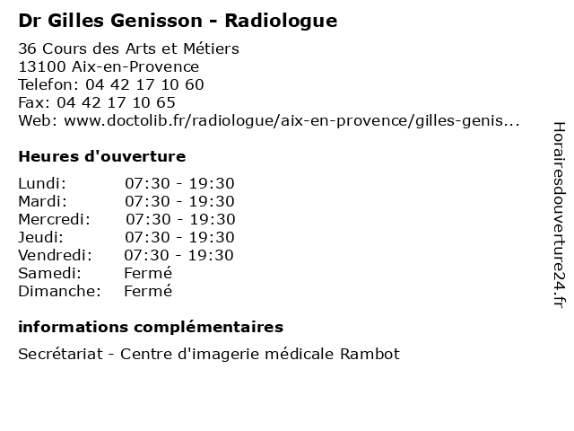 1 Dr Claude Gilles - Pneumologue (Distance: 0,12 km) 2 Avenue Du Dr F Aurientis,, 13100 Aix En Provence claude, dr, gilles, médecins, médicaments, pneumologue, santé, secrétariat, spécialiste 2 Dr. Gilles Boccara - Cardiologie (epreuve d'effort) (Distance: 0,15 km) 2 Rue du Docteur AURIENTIS, 13100 Aix en Provence boccara, cardiologie, consultation, d'effort, docteur, dr., epreuve, gilles, medecins, santé 3 Dr. Gilles Boccara - Cardiologie (actes de chirurgie) (Distance: 0,15 km) 2 Rue du Docteur AURIENTIS, 13100 Aix en Provence actes, boccara, cardiologie, chirurgie, consultation, de, docteur, dr., gilles, medecins, santé 4 Dr. Gilles Boccara - Cardiologie (controle de pace maker) (Distance: 0,15 km) 2 Rue du Docteur AURIENTIS, 13100 Aix en Provence boccara, cardiologie, consultation, controle, de, docteur, dr., gilles, maker, medecins, pace, santé 5 Maître Gilles Alligier - Avocat (Distance: 0,62 km) 14 bis Place des Prêcheurs, 13100 Aix en Provence alligier, avocat, avocats, civils, droits, gilles, juridiques, maître 6 Dr. Gilles Boccara - Cardiologie (Consultation sur rendez-vous) (Distance: 1,07 km) 32 Boulevard du Roi Rene, 13100 Aix en Provence boccara, cardiologie, consultation, docteur, dr., gilles, medecins, rendez, santé, sur, vous |