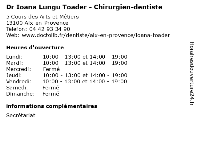 | Lundi | 10:00-13:00 et 14:00-19:00 |