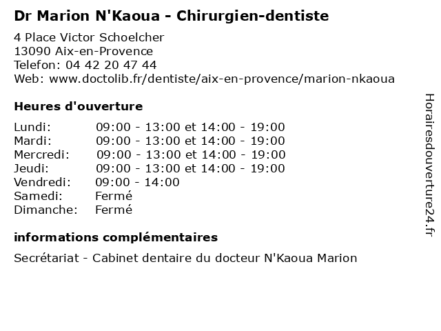 | Lundi | 09:00-13:00 et 14:00-19:00 |