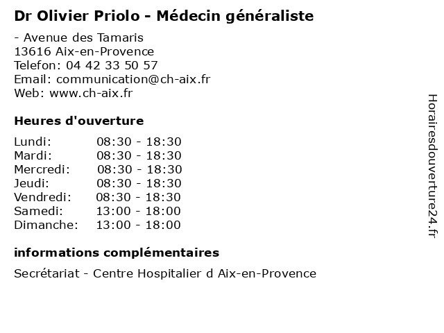 1 Dr Olivier Dufour - Chirurgien orthopédiste (Distance: 0,00 km) - Avenue des Tamaris, 13616 Aix-en-Provence chirurgien, consultation, docteur, dr, dufour, med, médecin, médecine, olivier, orthopédiste, traitement 2 Dr Olivier Baldesi - Anesthésiste (Distance: 0,00 km) - Avenue des Tamaris, 13616 Aix-en-Provence anesthésiste, baldesi, consultation, docteur, dr, med, médecin, médecine, olivier, traitement 3 Daunois Olivier (Distance: 0,46 km) 42 Avenue de Lattre de Tassigny, 13090 Aix-en-Provence daunois, olivier 4 Charcuterie Olivier (Distance: 0,54 km) 26 Rue Jacques de la Roque, 13100 Aix-en-Provence charcuterie, magasins, olivier, produits, vendre 5 Olivier Izabelle - Ostéopathe (Distance: 0,77 km) 28 Boulevard République, 13100 Aix-en-Provence izabelle, olivier, ostéopathe, santé 6 Dr Olivier Levy - Psychiatre (Distance: 0,80 km) 22 Rue Irma Moreau, 13090 Aix-en-Provence dr, folie, levy, olivier, psychiatre, psychiatrie, psychiatrique |
