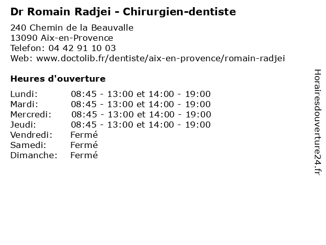 | Lundi | 08:45-13:00 et 14:00-19:00 |