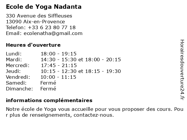 1 Laude Demay La Voie du Yoga (Distance: 2,92 km) 2 rue Lieutaud, 13100 Aix-en-Provence bien-être, cours collectifs, cours de yoga, demay, du, la, laude, mouvement, postures, relaxation, respiration, santé, voie, yoga 3 Yoga Solutions Santé (Distance: 3,81 km) 25 Cours Gambetta, 13100 Aix-en-Provence gestion, protection, santé, solutions, spécialiste, stress, yoga 4 Yoga - Association Arbre de Vie (Distance: 15,37 km) 41 Route d'Apt, 13240 Septèmes-les-Vallons arbre, association, de, exercice, mouvement, santé, septèmes, vie, yoga 5 Béatrice Latil (Distance: 1,99 km) 16 Avenue Alfred Capus, 13090 Aix-en-Provence beauté, béatrice, latil, massage, meditation, relax, salon, yoga 6 Centre Akasha (Distance: 2,95 km) 36 Rue Venel, 13100 Aix-en-Provence akasha, aromathérapie, beauté, centre, massage, relax, salon, yoga |