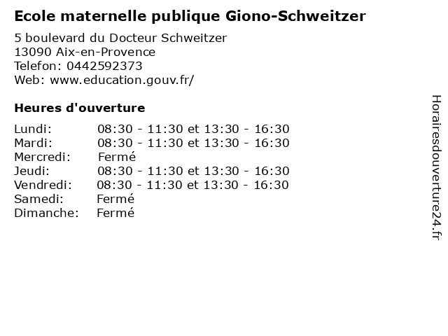 1 Ecole élémentaire publique Giono-Schweitzer (Distance: 0,17 km) 10 boulevard Germain Nouveau, 13090 Aix-en-Provence cio, coeur, collège, de, ecole, enseignement, garderie, giono, jean, l'apar, lycée, marie, maternelle, monteillet, nationale, orientation, primaire, publique, schweitzer, élémentaire 2 Aude Schweitzer - Pédicure-podologue & Ostéopathe (Distance: 0,21 km) 28 Rue Jules Verne, 13100 Aix-en-Provence aude, cabinet, d'aude, d'ostéopathie, de, et, ostéopathe, pieds, podologie, podologue, pédicure, pédicurie, schweitzer, soins 3 Cabinet Dentaire Giono (Distance: 0,94 km) 11 Avenue Jean Giono, 13090 Aix-en-Provence cabinet, dentaire, giono 4 Agnès Schweitzer - La Main Présence (Distance: 4,14 km) 17 Square Abbé Blaise, 13080 Aix-en-Provence agnès, la, main, présence, schweitzer 5 Ecole élémentaire publique Jean Giono (Distance: 13,84 km) 185 avenue de la République, 13880 Velaux cio, college, cours, ecole, education, elementaire, enseignement, giono, jean, lycee, maternelle, nationale, orientation, primaire, publique, élémentaire 6 Ecole maternelle publique Jean Giono (Distance: 14,08 km) - Avenue de la République, 13880 Velaux cio, college, cours, ecole, education, elementaire, enseignement, giono, jean, lycee, maternelle, nationale, orientation, primaire, publique |