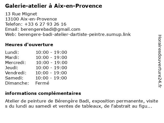 1 L'Atelier des Chefs (Distance: 0,06 km) 14-16 Rue Constantin, 13100 Aix-en-Provence chefs, cuisine, d'cuisine, des, ecole, l'atelier, restaurant, restauration 3 Galerie Amaury Goyet (Distance: 0,09 km) 17 Rue de Montigny, 13100 Aix-en-Provence amaury, exposition, galerie, galerie d'art, goyet, musée, peinture 4 Galerie Ars Longa (Distance: 0,12 km) 2 Rue Jaubert, 13100 Aix-en-Provence ars, arts, déco, décoratifs, galerie, longa, musée 5 Galerie Le Container (Distance: 0,16 km) 4 Rue Granet, 13100 Aix-en-Provence arts, container, déco, décoratifs, galerie, le, musée 6 L'Atelier du Décorateur (Distance: 0,16 km) 39 Rue Granet, 13100 Aix-en-Provence du, décorateur, l'atelier |
