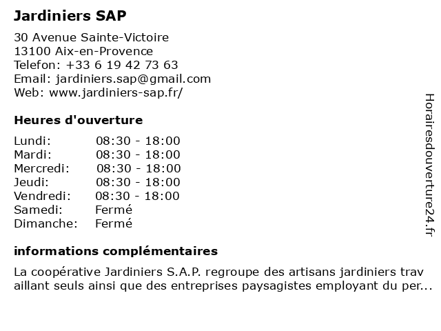 1 Jardiniers Sap (Distance: 6,91 km) 46 Chemin de la Sarrière, 13590 Meyreuil decoration, jardin, jardiniers, meyreuil, plante, sap 5 Jardiniers SAP Aix En Provence (Distance: 1,05 km) 41 Avenue Henri Pontier, 13100 Aix-en-Provence aix, en, jardiniers, provence, sap 6 Jardiniers SAP Aix En Provence (Distance: 1,58 km) 67 Cours Gambetta, 13100 Aix-en-Provence aix, en, jardiniers, provence, sap |
