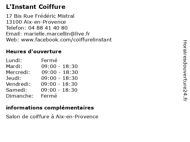 | Lundi | Fermé |