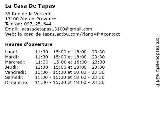 | Mardi | 11:30-15:00 et 18:00-23:30 |