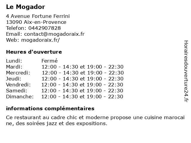 Mercredi | 12:00-14:30 et 19:00-22:30 |