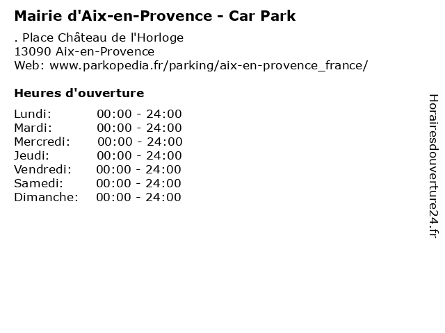 1 Mairie d'Aix-en-Provence - Car Park (Distance: 2,25 km) 6 Rue des Etuves, 13100 Aix-en-Provence automobile, car, d'aix, en, mairie, park, parking, provence, services 2 Mairie d'Aix-en-Provence - Car Park (Distance: 2,31 km) . Avenue Victor Hugo, 13100 Aix-en-Provence automobile, car, d'aix, en, mairie, park, parking, provence, services 3 Mairie d'Aix-en-Provence - Car Park (Distance: 2,33 km) . Rue Jean Andreani, 13090 Aix-en-Provence automobile, car, d'aix, en, mairie, park, parking, provence, services 4 Mairie d'Aix-en-Provence - Car Park (Distance: 2,37 km) . Avenue Philippe Solari, 13100 Aix-en-Provence automobile, car, d'aix, en, mairie, park, parking, provence, services 5 Mairie d'Aix-en-Provence - Car Park (Distance: 2,50 km) . Avenue Winston Churchill, 13100 Aix-en-Provence automobile, car, d'aix, en, mairie, park, parking, provence, services 6 Mairie d'Aix-en-Provence - Car Park (Distance: 2,84 km) . Chemin de la Plaine, 13080 Aix-en-Provence automobile, car, d'aix, en, mairie, park, parking, provence, services |