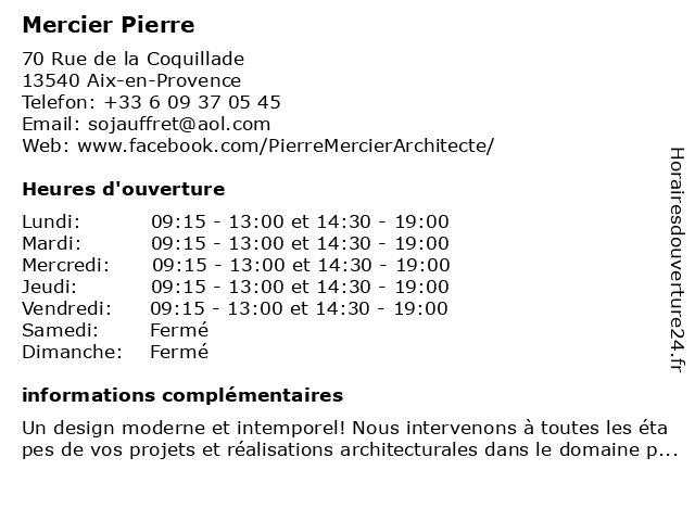 | Mercredi | 09:15-13:00 et 14:30-19:00 |