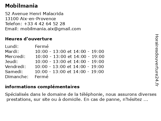 1 Relais Colis® / MOBILMANIA (Distance: 0,90 km) 52 Avenue Henri MALACRIDA, 13100 Aix en Provence colis, colis®, mobilmania, relais, services postaux et de livraison |