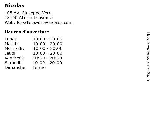 1 Nicolas (Distance: 0,00 km) 105 Avenue Giuseppe Verdi, 13100 Aix-en-Provence champagnes, hyper-supermarchés, nectars, nicolas, vente au détail de vin, vin 2 Nicolas Campet - Masseur-kinésithérapeute (Distance: 0,75 km) 23 Rue du 4 Septembre, 13100 Aix-en-Provence cabinet, campet, d'ostéopathie, de, et, kiné, kinésithérapeute, kinésithérapie, masseur, mazarin, nicolas, rééducation, soin 3 Halberstadt Nicolas (Distance: 0,90 km) 3 Rue Manuel, 13100 Aix En Provence halberstadt, nicolas, restaurants 4 Dr Nicolas Galatis - Médecin généraliste (Distance: 1,00 km) - Avenue des Tamaris, 13616 Aix-en-Provence consultation, docteur, dr, galatis, généraliste, med, médecin, médecine, nicolas, traitement 5 Nicolas Humez - Masseur-kinésithérapeute (Distance: 6,89 km) 485 Rue Marcellin Berthelot, 13290 Aix-en-Provence bien-être, en, forme, humez, kinésithérapeute, kinésithérapie, masseur, nicolas, remise, rééducation 6 Barbet Nicolas (Distance: 15,34 km) 3 b Rue Quilho Pas, 13610 Le Puy Sainte Reparade barbet, nicolas, restaurants |